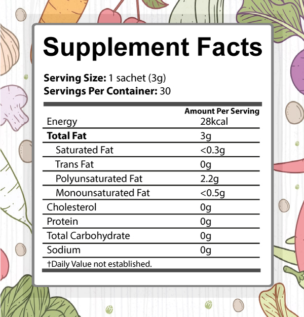 In my daily life, instead of three omega-3 gel capsules of 1000mg, I take one sachet = 3g of this perilla seed oil with juice, soup, or meal. We don’t have to take unnecessary gel ingredients to meet essential fatty acids requirements.