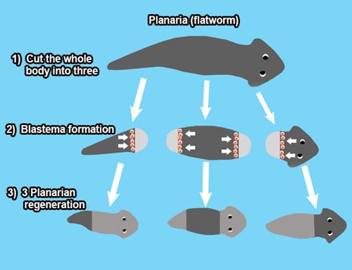 The stem cells of humans have a limited ability to differentiate. But for example, Planaria that is a small flatworm living in rivers has an amazing ability to differentiate into any organs, even into itself. When it is chopped into 3 fragments like a picture, each fragment regenerates to a perfect Planaria. There is a record that 1/279 fragment of one Planaria regenerated to perfect Planaria. When Planaria grows to a certain size, it divides itself to two fragments. And each fragment grows to a perfect Planaria. For Planaria, division and regeneration are mechanisms for reproduction. But under some circumstances, Planaria chooses sexual reproduction.