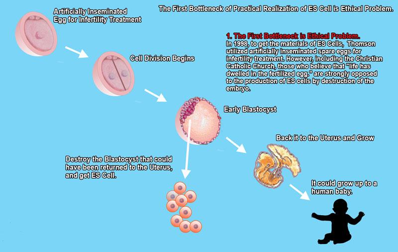 James Thomson created ES Cells from Monkey embryo in 1995 and later in 1998 created ES Cells from a human embryo. However, research into ES Cell needs further study due to an ethical dilemma, that in order to isolate inner cells from the blastocyst, the blastocyst is destroyed, so is the embryo at the pre-implantation stage to be considered human? and even if not, do we have the right to destroy human potential growth.