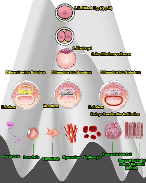 ICM cells can differentiate into any cell type, except placenta — pluripotency. 3 weeks after fertilization, the cells of the inner cell mass differentiate into ectoderm, mesoderm, and endoderm. In the 1950s, this differentiation was thought to be irreversible, being described as a ball rolling down a hill and technically known as ” Epigenetic Landscape”.