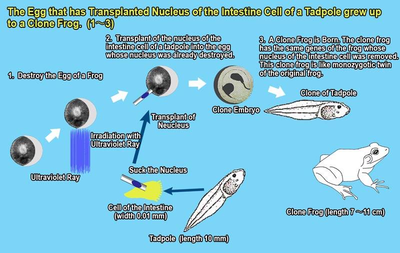 - He removed the intestinal cell “tadpole nucleus” of Frog B which was transplanted into Frog A’s ovum, the nucleus of which was already destroyed by ultraviolet rays. This new ovum became Clone Embryo B which grew into Frog B’s tadpole was later to become cloned adult Frog B.