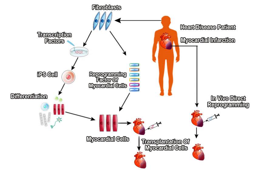 Recently it was found possible to induce, directly from somatic cells, not only iPS but nerve cells, hepatocyte cells, myocardium cells, cartilage cells, and many varied cells by introducing the specific key transcription factors in cell differentiation, which means that through by-passing of pluripotent stem cells it is possible to induce differentiated specific cells from somatic cells. This is called “Direct Reprogramming”, and the most exciting research for example is: myocardial reprogramming in vivo, where Doctors inject patient’s fibroblasts with transcription factors to the infarcted lesion of the heart.