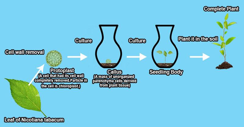 A Plant can regenerate itself from one already differentiated cell. An Enzyme mixture of Cellulase Onozuka R-10 and Macerozyme R-10 dissolves tobacco plant (Nicotiana tabacum) leaf cell walls, and cells become leaf protoplasts (= cell without cell walls). When protoplasts are cultivated under appropriate condition, the protoplasts grow to a seedling plant through plant callus (= mass of unorganized parenchyma cells). When the seedling plant is planted in soil, it grows to a perfect tobacco plant.